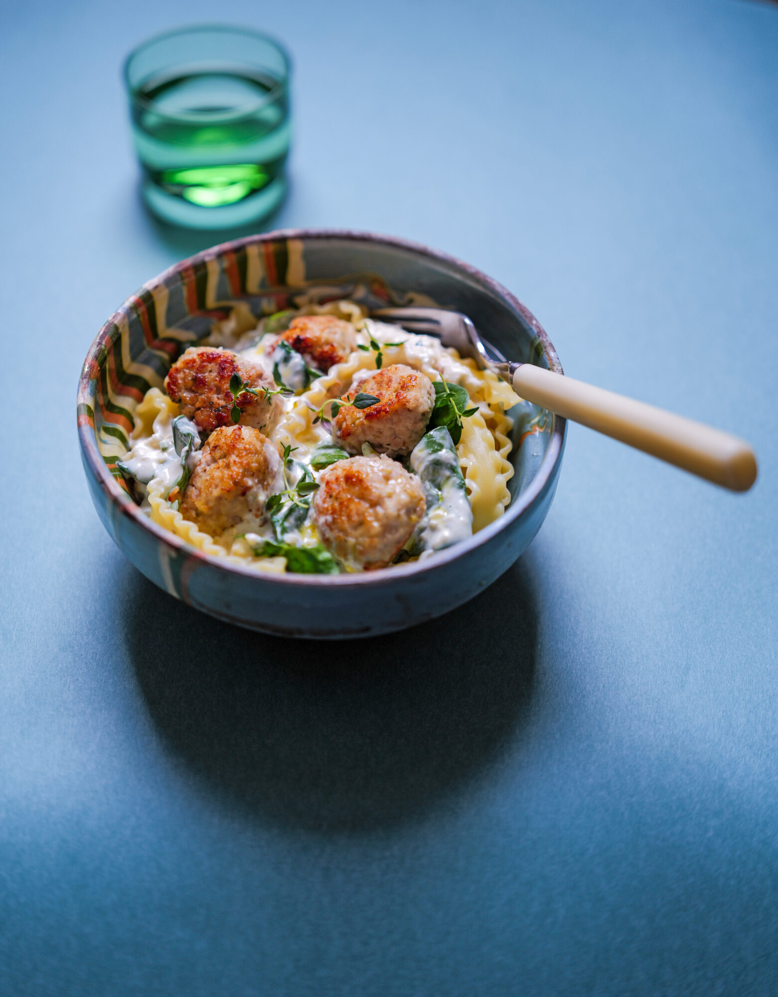 Riv opp eller kvern i blender innmaten fra lyst brød og legg i melk. Kjør kjøttdeig med salt i en kjøkkenmaskin. Når konsistensen er seig, tilsetter du brødet og melken. Tilsett pepper, parmesan og timian, oregano og ricotta. Form til små kjøttboller med hjelp av to skjeer som du dypper i kaldt vann mellom hver kjøttbolle. Stek i pannen til de er gylne, ta ut og etterstek ev. i ovnen til de er gjennomstekte. Rør ricotta ut i fløten i en bolle. Rør inn parmesan og muskat. Finhakk løk og hvitløk, og stek i pannen til blandingen er myk og blank. Hell over fløteblandingen og kok forsiktig opp. Smak til med saltog pepper. Slipp spinat i pannen og rør inn rett før servering. Tilsett kjøttbollene og dryss over litt timian. Server med valgfritt tilbehør.