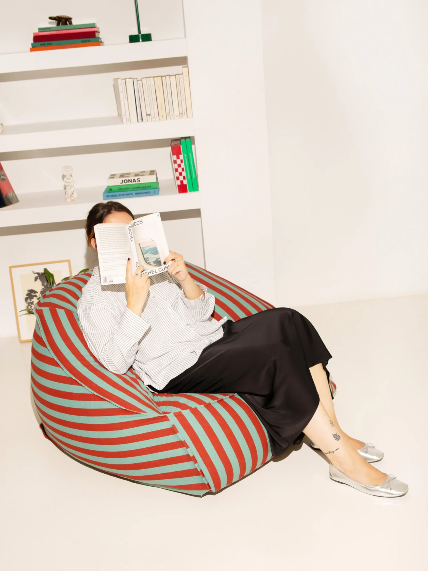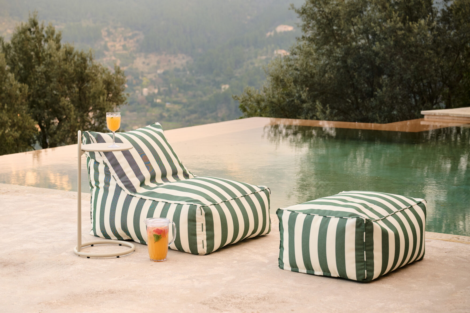 Take it easy: Eaze sekkestol med grønne striper i slitesterkt olefin-tekstil, kr 2499, Eaze puff, kr 1799, og Anton sidebord, kr 499, Kid Interiør.