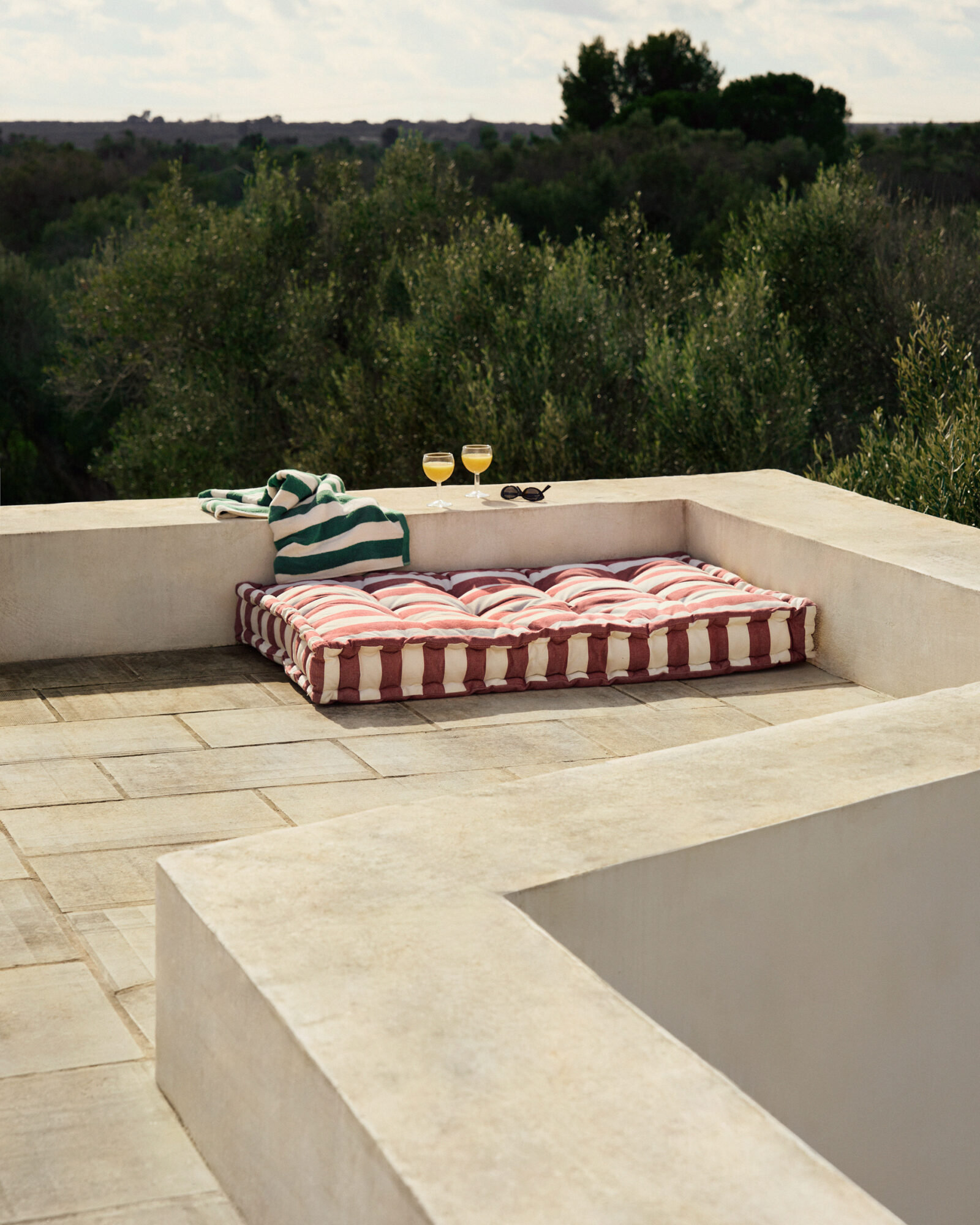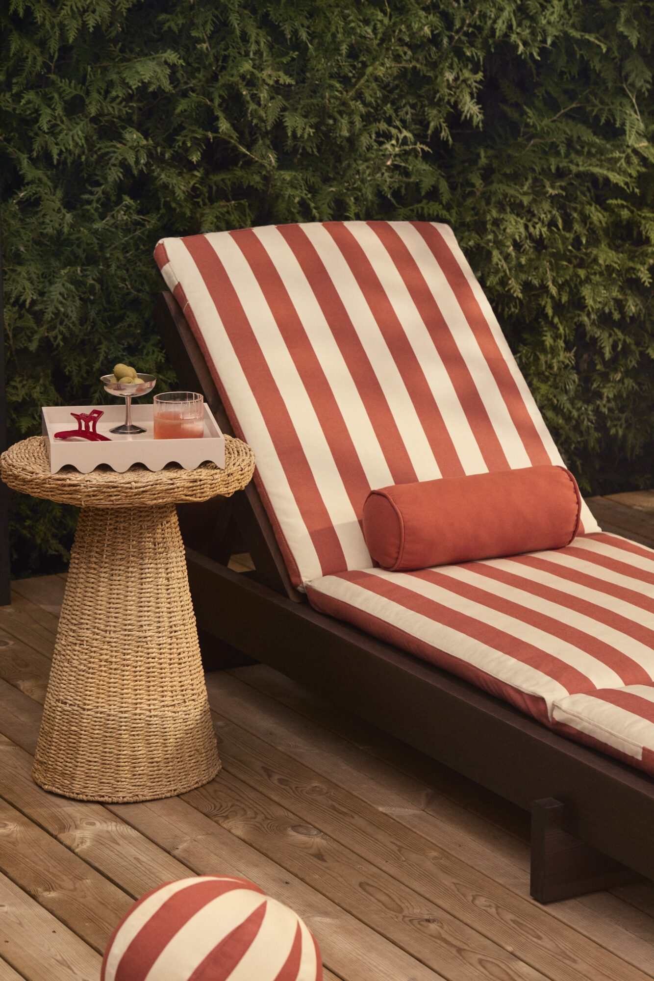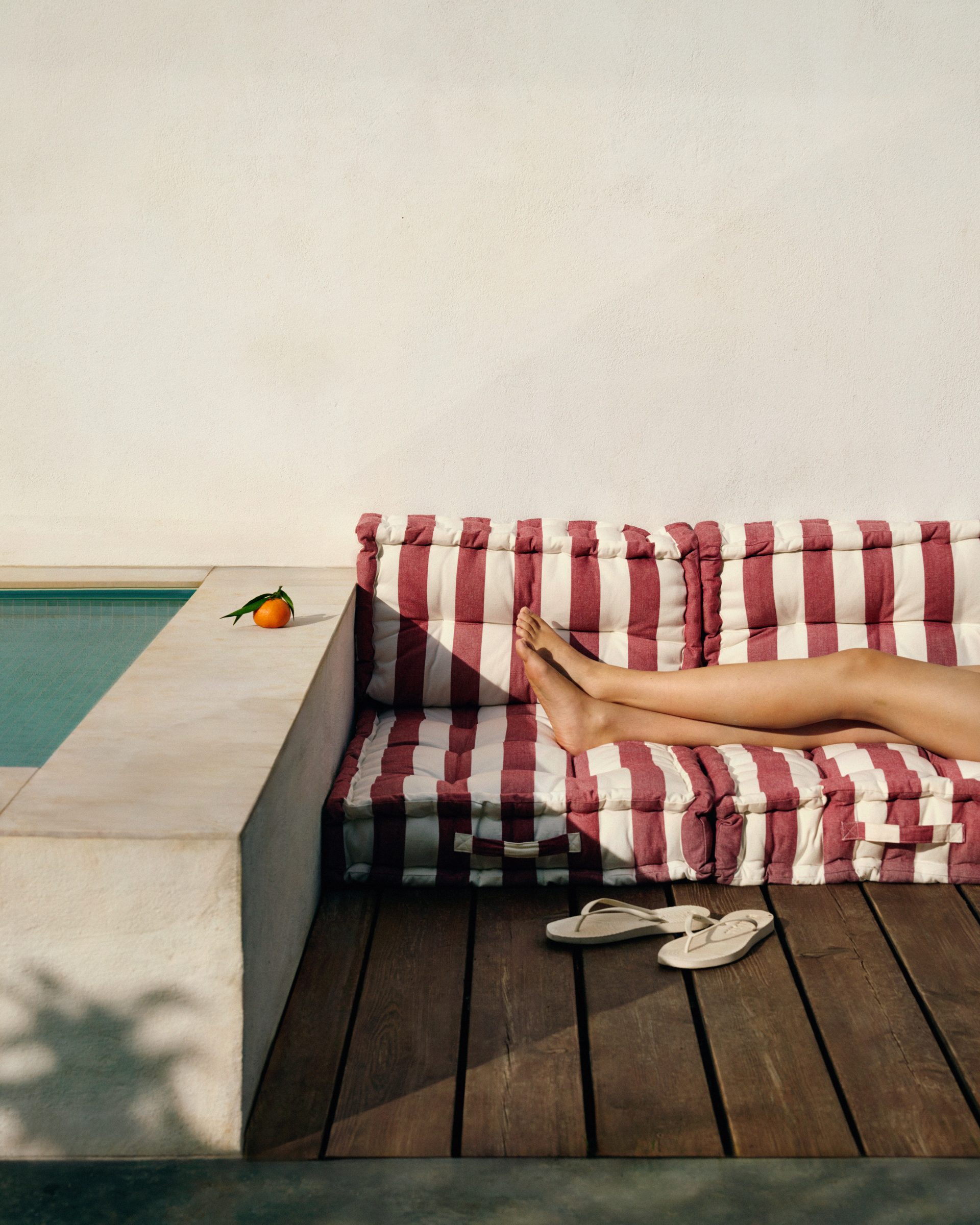 På beach cluben: Det rødstripete, vannavvisende og UV-bestandige tekstilet fra den nye Club Sol-serien til Bemz, er inspirert av leken nostalgi og glamor. Trekk til Frösön/Duvholmen-pute fra Ikea, fra kr 1499. Kommer også i brunt og sennepsgult.